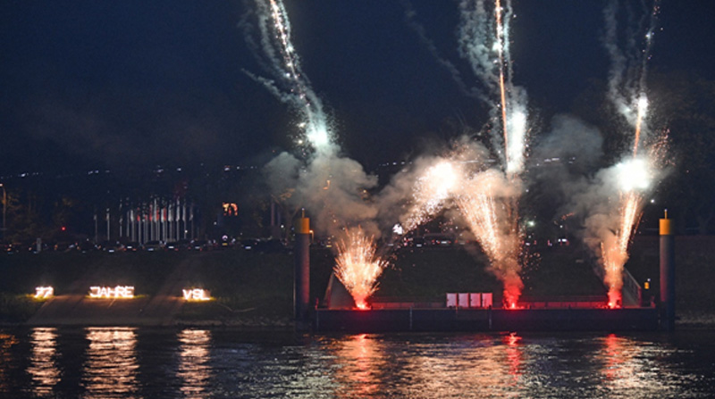 Um ca. 22:00 kam dann für alle überraschend das Highlight des Abends! In einem brennenden Schriftzug konnten unsere Gäste vom Schiff aus an der Rheinpromenade das Motto des Abends „VSL NRW 77 Jahre“ lesen und dann ein atemberaubendes Feuerwerk genießen. Perfekt mit der Musik abgestimmt wurden die Raketen gezündet und der Düsseldorfer Nachthimmel farbenfroh erleuchtet. Gegen 23:00 legte das Schiff wieder an und bis in die frühen Morgenstunden wurde ausgiebig unser Jubiläum gefeiert.